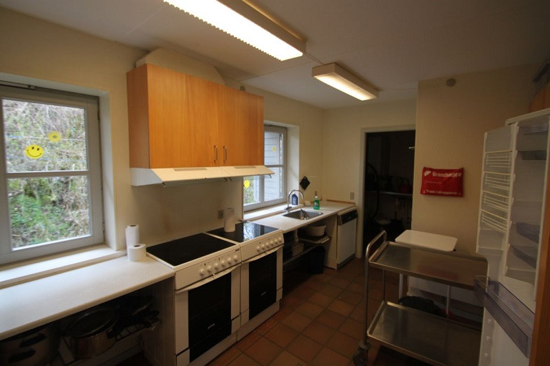 - 1 gut ausgestattete Selbstversorgerküche mit Spülmaschine, E-Herd, Backofen, Kühl- und Gefrierschrank ist ausreichend für bis zu 50 Personen